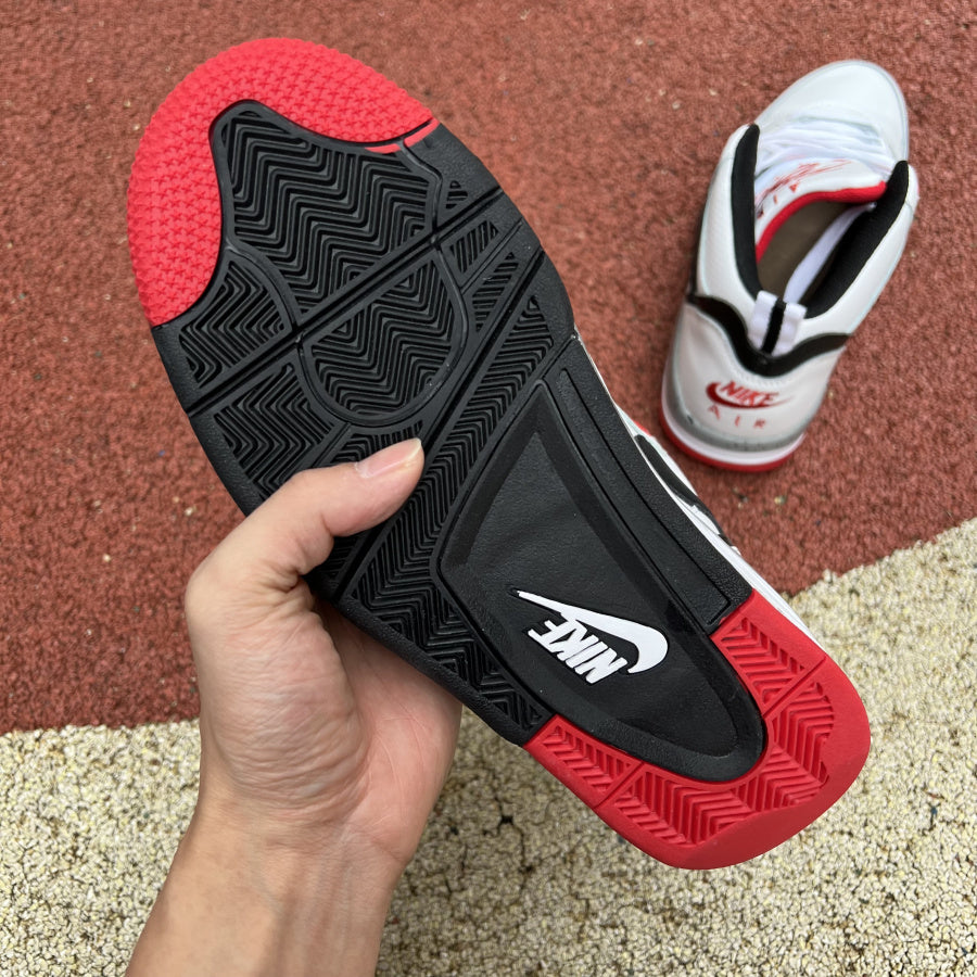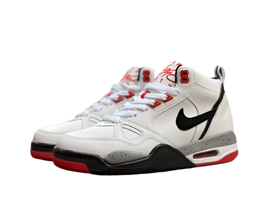 The upper is crafted from pristine white leather, offering a clean and versatile base that is both striking and understated. The grey suede overlays add a layer of texture and contrast, enhancing the shoe’s overall look. The standout feature of this model is the vibrant red accents, which are prominently displayed on the Jumpman logo, the outsole, and the inner lining, providing a dynamic pop of color that energizes the classic design.